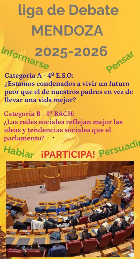 Mañueco: "En Castilla y León tenemos los mejores cimientos para que los alumnos elijan el futuro que quieran" LA LIGA DE DEBATE DEL MENDOZA éxito garantizado año tras año Una actividad que despierta el entusiasmo de toda la comunidad educativa Los días 29 (4º de la ESO) y 30 (1º de bachillerato) de enero celebramos la liga de debate del curso 25-26. este año tenemos que destacar el altísimo nivel de todos los equipos participantes.EL DEPARTAMENTO DE ORIENTACIÓN TE AYUDA A ELEGIR TELÉFONO CONTRA EL ACOSO ESCOLAR: 900 018 018PLC - Proyecto Lingüístico de Centro (Clica para acceder a todos los recursos)